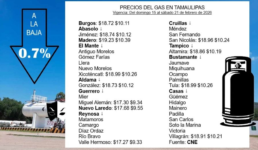 Los nuevos precios a partir de este domingo 15 de febrero, con vigencia hasta el sábado 21, para los municipios Casas, Güémez, Hidalgo, Mainero, Padilla, San Carlos, Soto la Marina, Victoria y Villagrán (región 196) son: